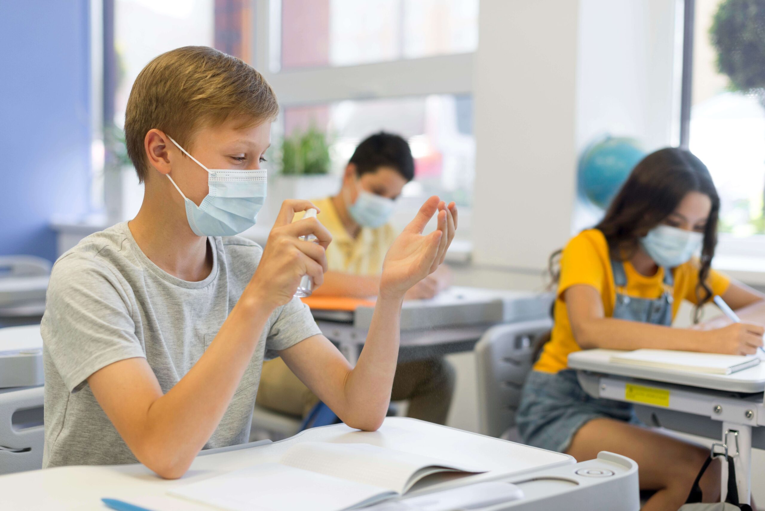 - Girl in school using hand sanitizer and wearing mask by Freepik